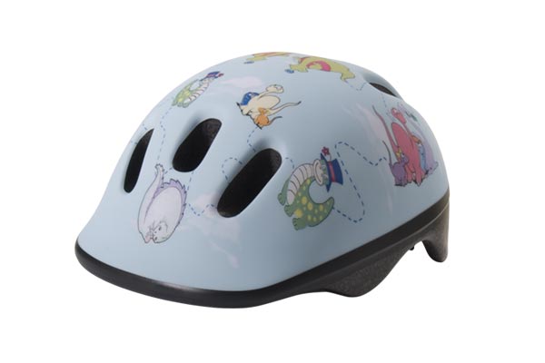 Tuff barnhjälm som finns i en stor mängd olika motiv. Här med dinosaurie-motiv. Utrustad med grönt säkerhetsspänne. Testad och godkänd.